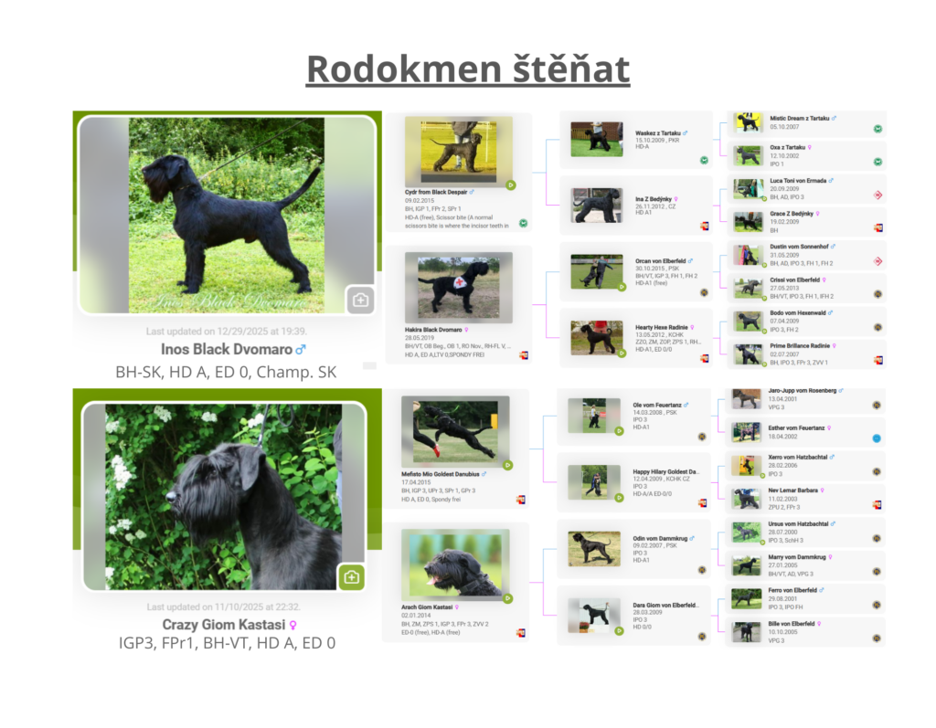 Matkou je naše fena Crazy Giom Kastasi, kterou jsme si nechali z našeho třetího vrhu. Je to temperamentní fena s velkou chutí do práce. Má složenu nejvyšší zkoušku IGP 3, kterou jsme spolu složily na podzim 2025. S Crazy jsme se účastnily v roce 2024 Mistrovství republiky kníračů, kde získala v kategorii IGP 1 druhé místo. Také jsme spolu absolvovaly menší stopařské závody. Věnujeme se hlavně výcviku, což nás společně velmi baví. Více o Crazy si můžete přečíst také zde.